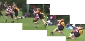 Having seen what Sasha does when she doesn't have the ball, we now turn to what she can do when she has it. First we see a typical Sasha hand-off, then we find that the inconvience of having one of the Exeter girls hanging round her waist from about 20m out is not going to stop her reaching the line...